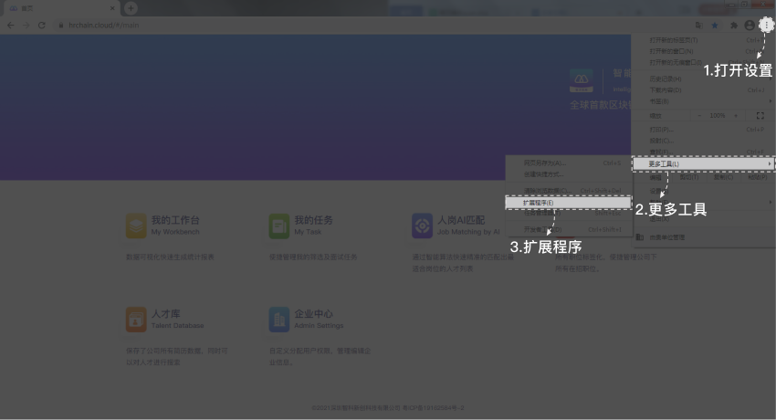 (2)下载插件后打开谷歌扩展程序,如图右上角->更多工具->扩展程序。