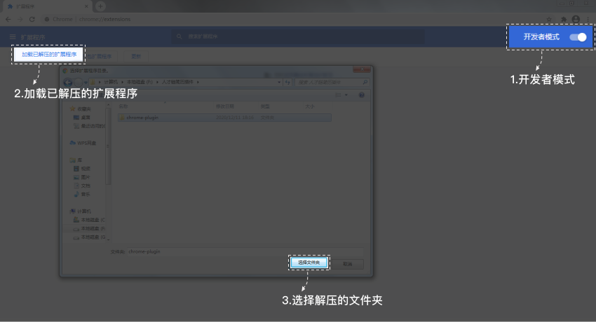 (3)打开开发者模式,点击已解压的扩展程序->找到已解压的文件夹->点击选择文件夹 完成添加,或者将第一步解压的文件夹拖拽到扩展程序页面,完成添加。