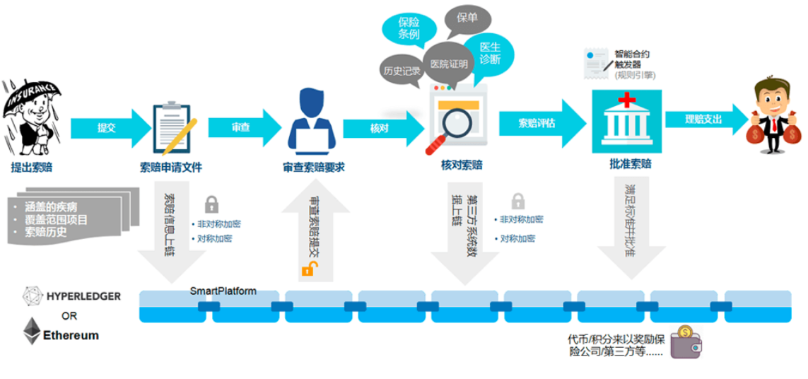通过引入区块链技术,将患者,医疗机构,保险机构,金融机构,监管机构链接起来,实现医疗保险理赔过程中的信息安全共享,流程自动高效和全过程监管